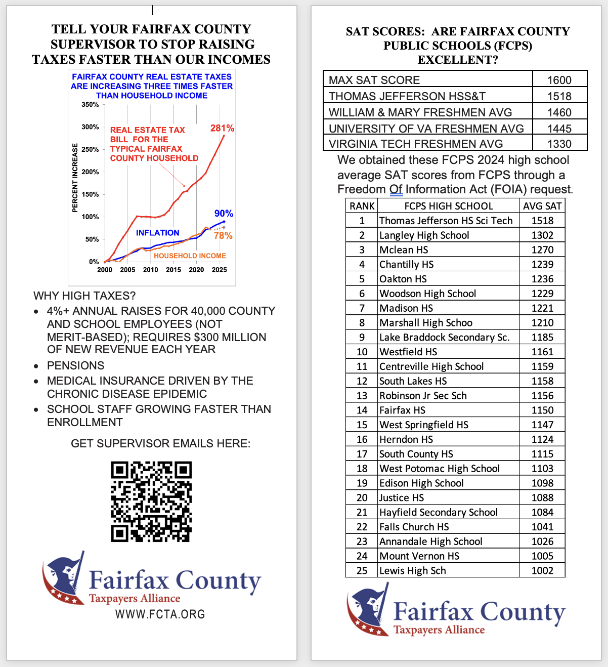 Since 2000, Fairfax County real estate taxes have increased much faster than household incomes. Pension liabilities, salary increases, social programs, and large school budgets have been out of control for years.